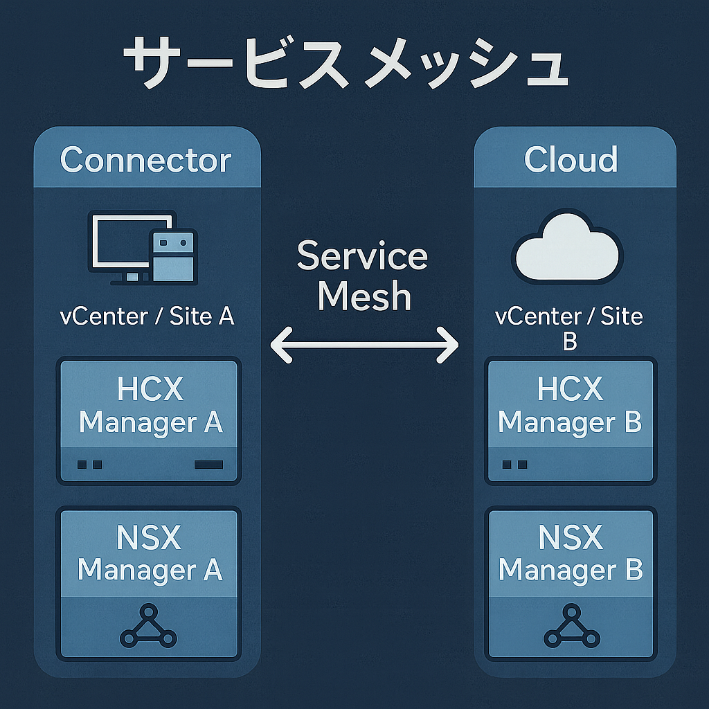 本記事では、HCX(VCF Operations HCX / 旧 VMware HCX) の サービスメッシュ(Service Mesh) を構築するための手順を記載します。