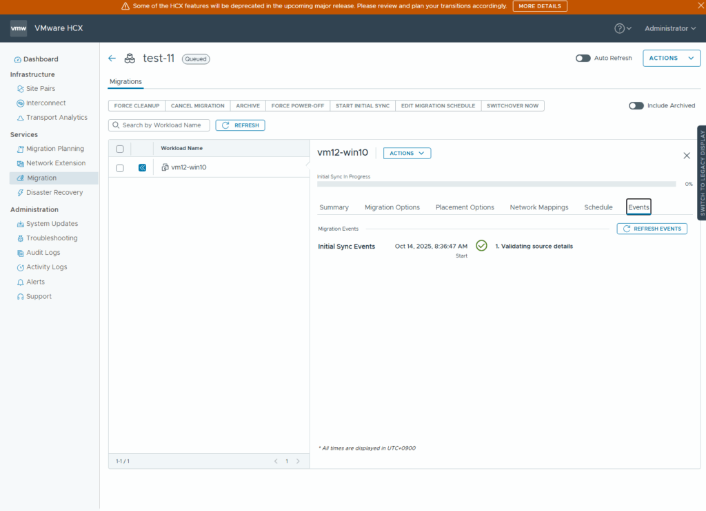 - 移行の進捗は確認したい該当の Mobility Group 名をクリックし、「Events」タブをクリックします。