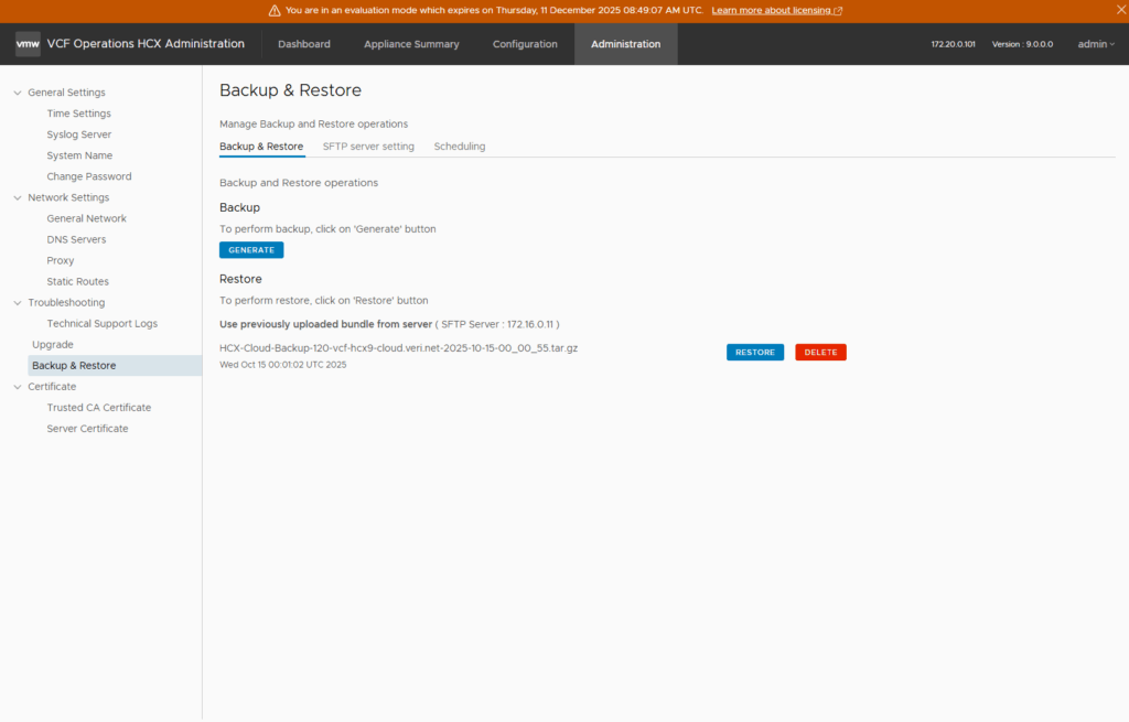 2. Administration → Backup & Restore → SFTP server setting タブを選択します。